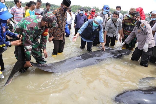 Beritana, Bangkalan - Sebanyak 49 paus dilaporkan terdampar di pesisir Desa Patreman, Modung, Bangkalan, Madura, sejak Kamis (18/02), demikian disampaikan oleh Kapolsek Modung AKP Suwaji kepada detik.com, Jumat (19/02). Tiga paus dilaporkan masih hidup dan sudah dikembalikan ke tengah laut, sementara sisanya dilaporkan mati.